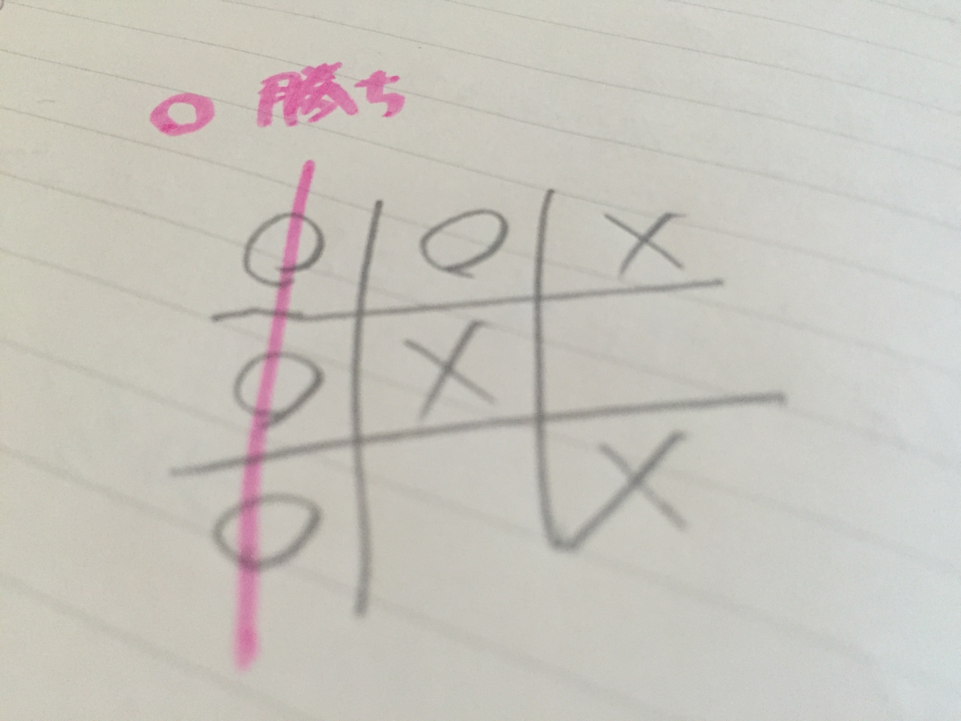 マルバツゲームはご存知でしょうか?2人で対戦するゲーム。よく紙に書いて対戦したのを覚えている。マルかバツに分かれてマスを埋めていく。どちらかが縦・横・斜めに揃った時点で勝ちとなる。